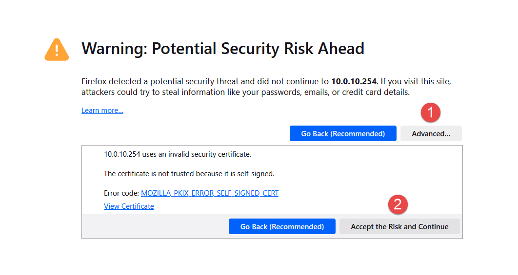 • NOTE: A page may appear stating that the website is not safe. This is due to the web interface using a self-signed certificate that an external authority cannot validate. This message can be ignored.