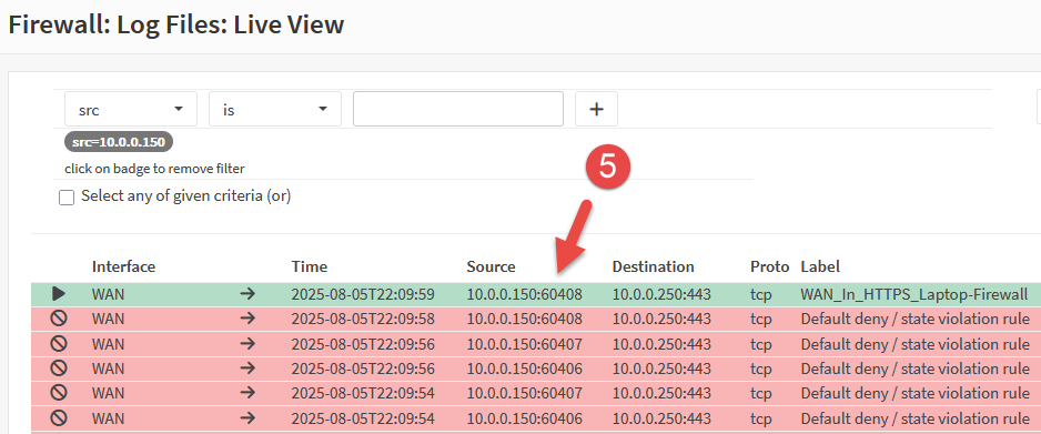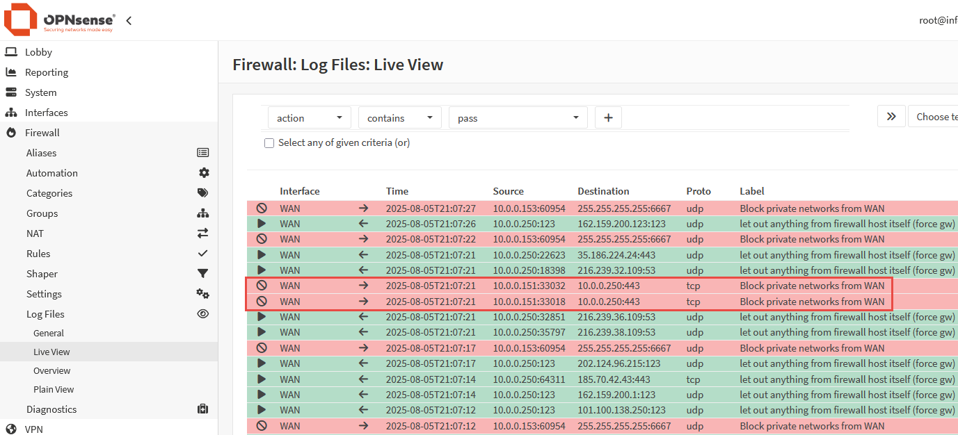 Evidence of this can be found in the firewall logs, accessible from Firewall > Log Files > Live View.
