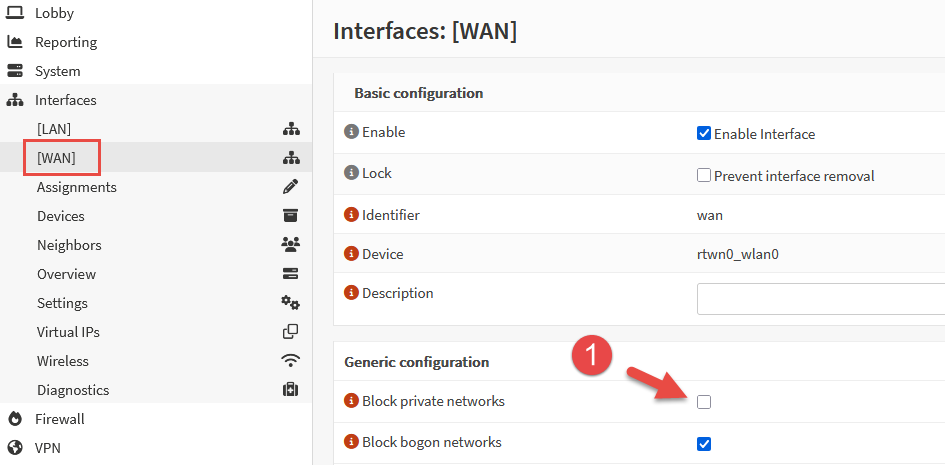 In order to remove the default rule blocking private networks from access via the WAN, navigate to Interfaces > WAN and unselect the option Block private networks and click Save. This will remove the default rule from it’s position in the upper level of rule table, allowing a custom rule to be added to allow inbound connections from specific addresses.