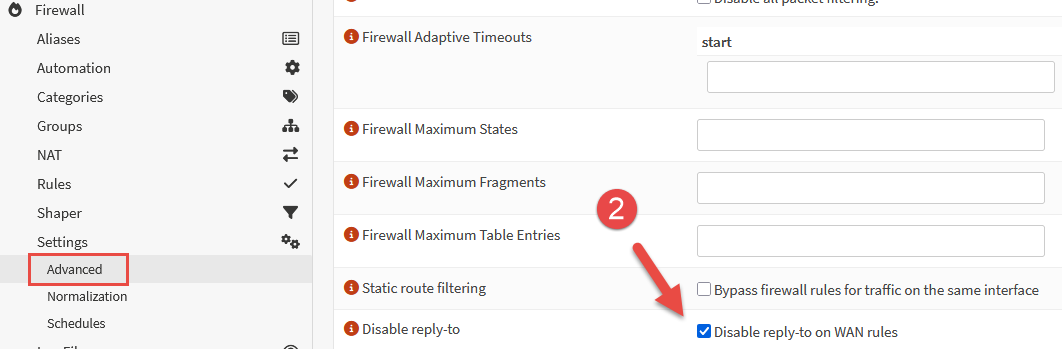 The second setting required to allow this to work can be found under Firewall > Settings > Advanced. Locate the setting Disable reply-to and enabled this tick box. Click Save.