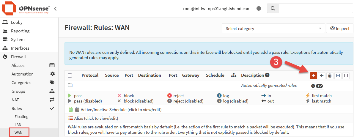 Lastly, we need to add a firewall rule to allow the connection, as all inbound WAN connections are blocked by default. Navigate to Firewall > Rules > WAN and click the small + icon on the right side of the rule table to create an new rule.