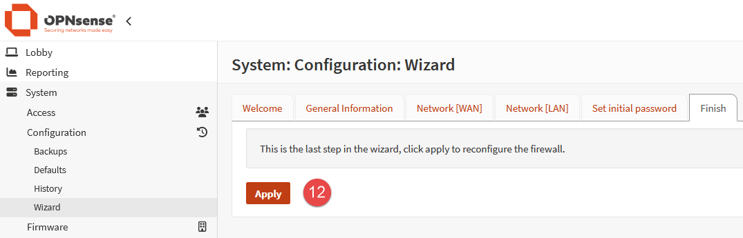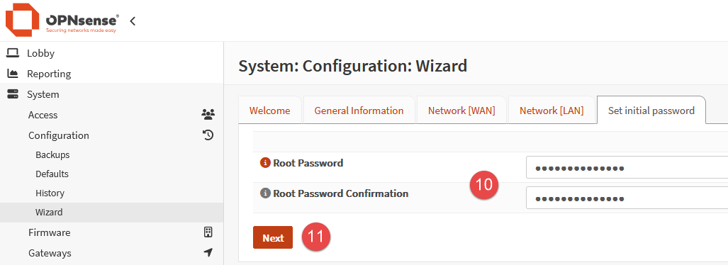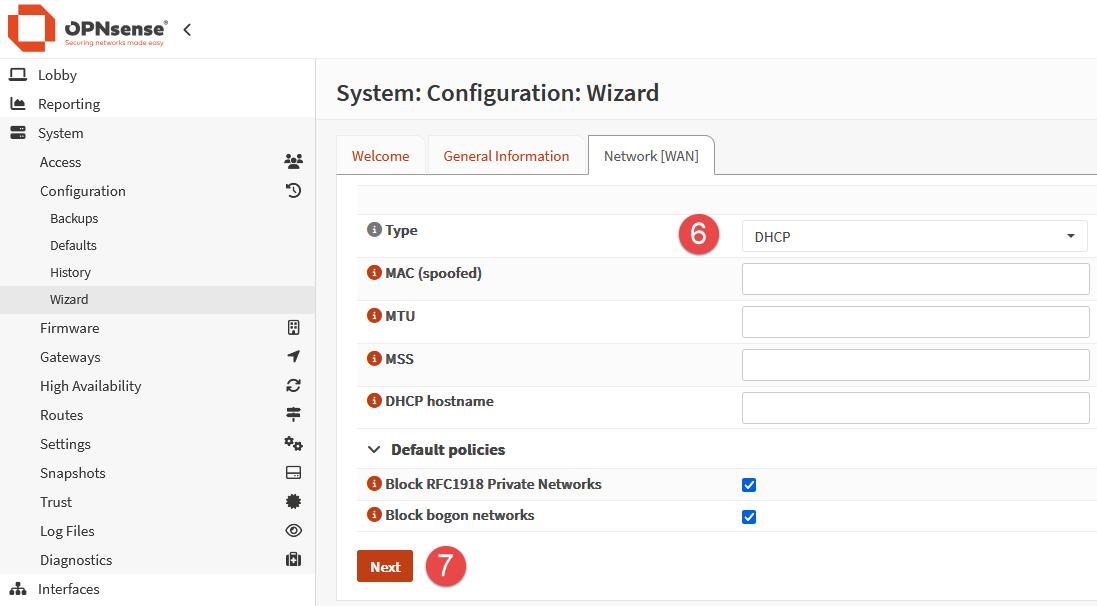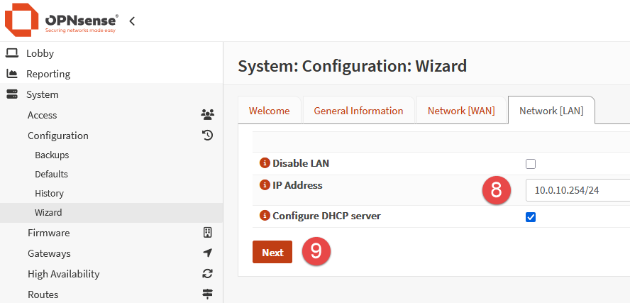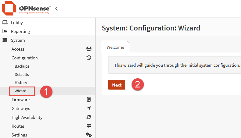 With OPNsense installed, now we can proceed to configure it. Navigate to System > Configuration > Wizard and click Next.