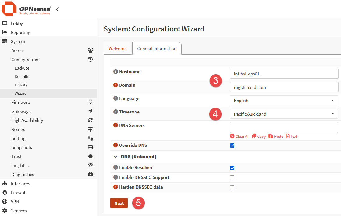 Set the desired hostname and domain name to use for the device. Select your time zone, leave the other options as default and click Next.