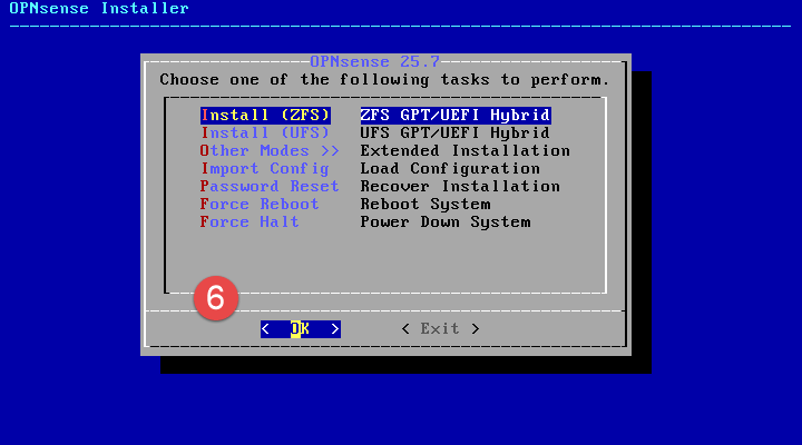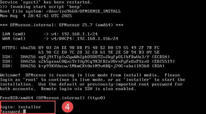 • NOTE: The default behavior of OPNsense is to boot into a live environment, therefore installation steps are still required post-boot process.