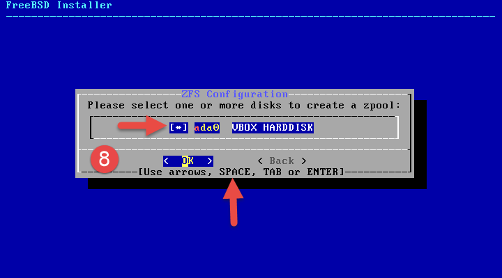 Select the disk to install OPNsense on, making sure to use the spacebar button to select the item from the list.