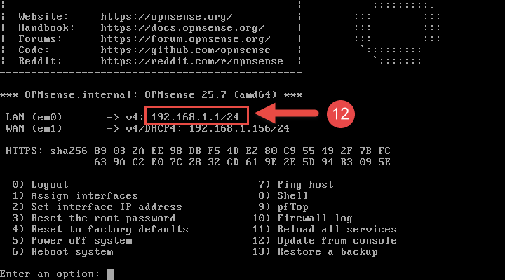When OPNsense is done booting up, it will present the LAN interface IP address, on which the web interface can be accessed from another device.
