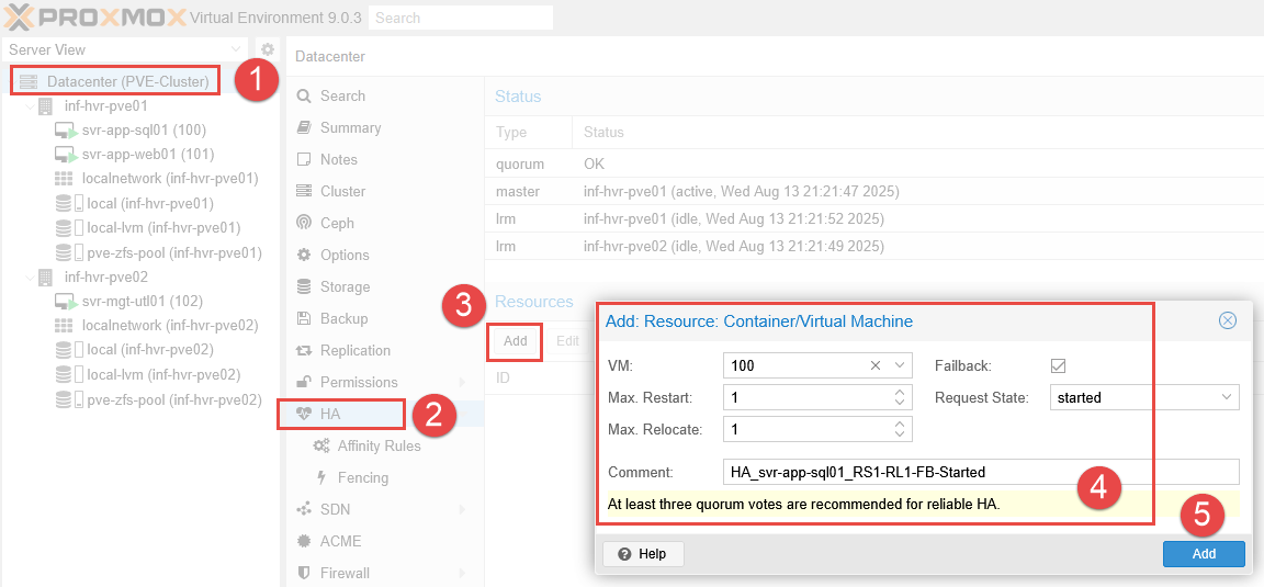 3. Add one or more VMs within the HA Resources field. Note that only VMs added to HA in the previous step will be listed.