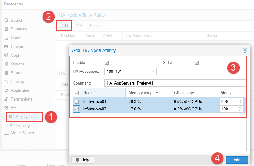This works by assigning a score to each of the Proxmox nodes. Higher the integer, the higher the priority for the VM to run on that node. This helps to relocate VMs during failover events, targeting the higher priority nodes over the lower priority nodes.