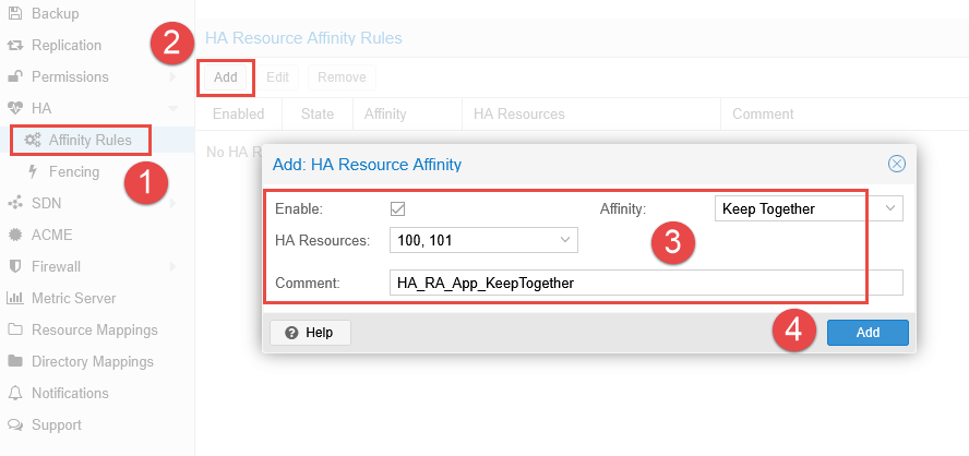 1. Navigate to Datacenter > HA > Affinity Rules.