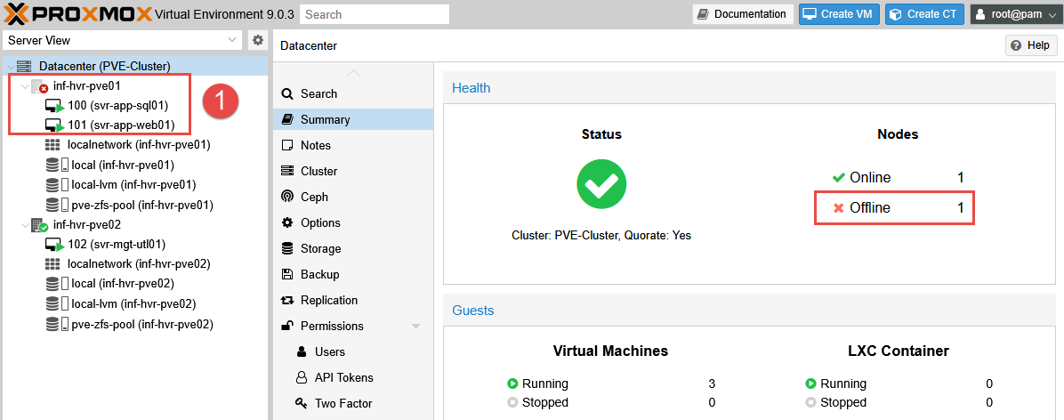 With the ethernet cable pulled, the offline Proxmox node is detected within 10 seconds and visible from within the Proxmox web interface.